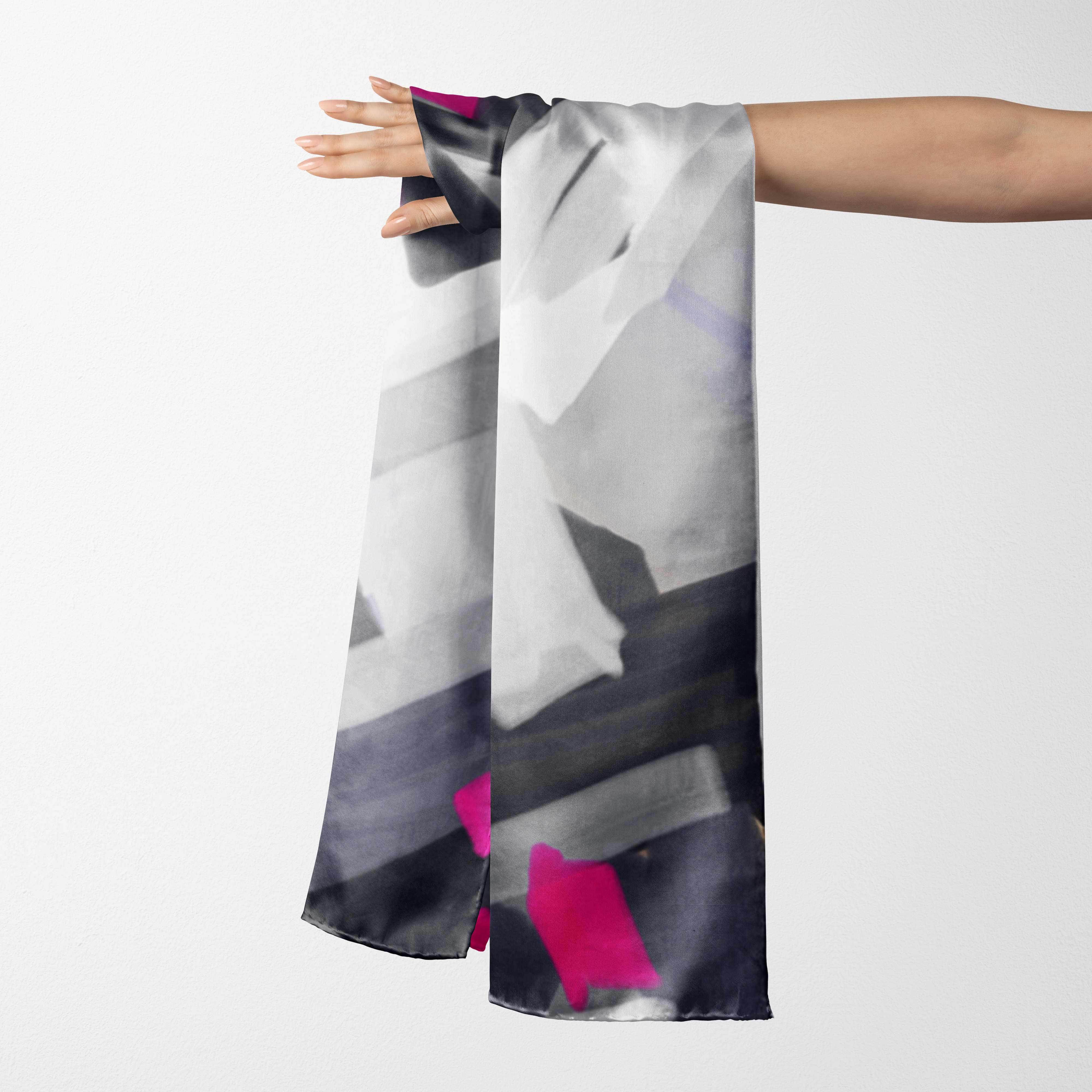 La sciarpa di seta viene fornita avvolta nella nostra esclusiva confezione rosa e include una carta di autenticità firmata dall'artista.