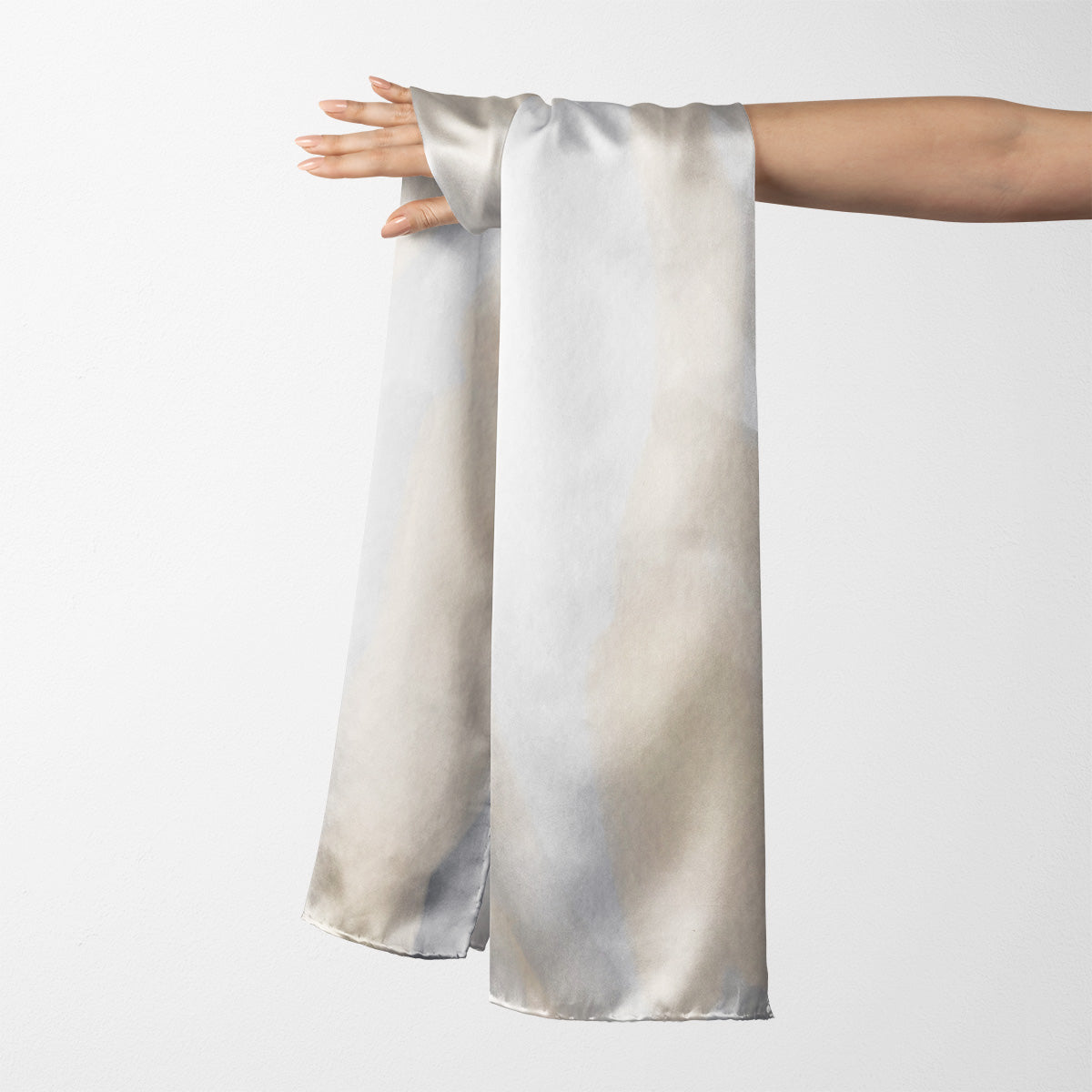 Questa sciarpa morbida e scintillante presenta un dipinto che cattura la sottile gamma di creme e tenui tonalità sabbia. Fa parte della linea Ethereal, ispirata all'intricata bellezza dell'interno delle conchiglie, che si trovano sulle spiagge di tutto il mondo.