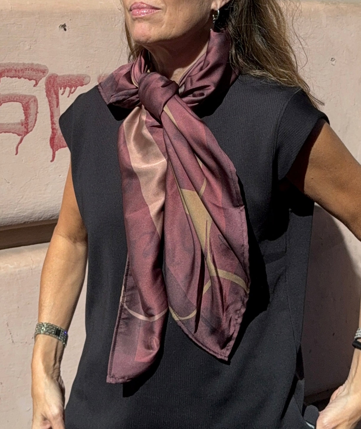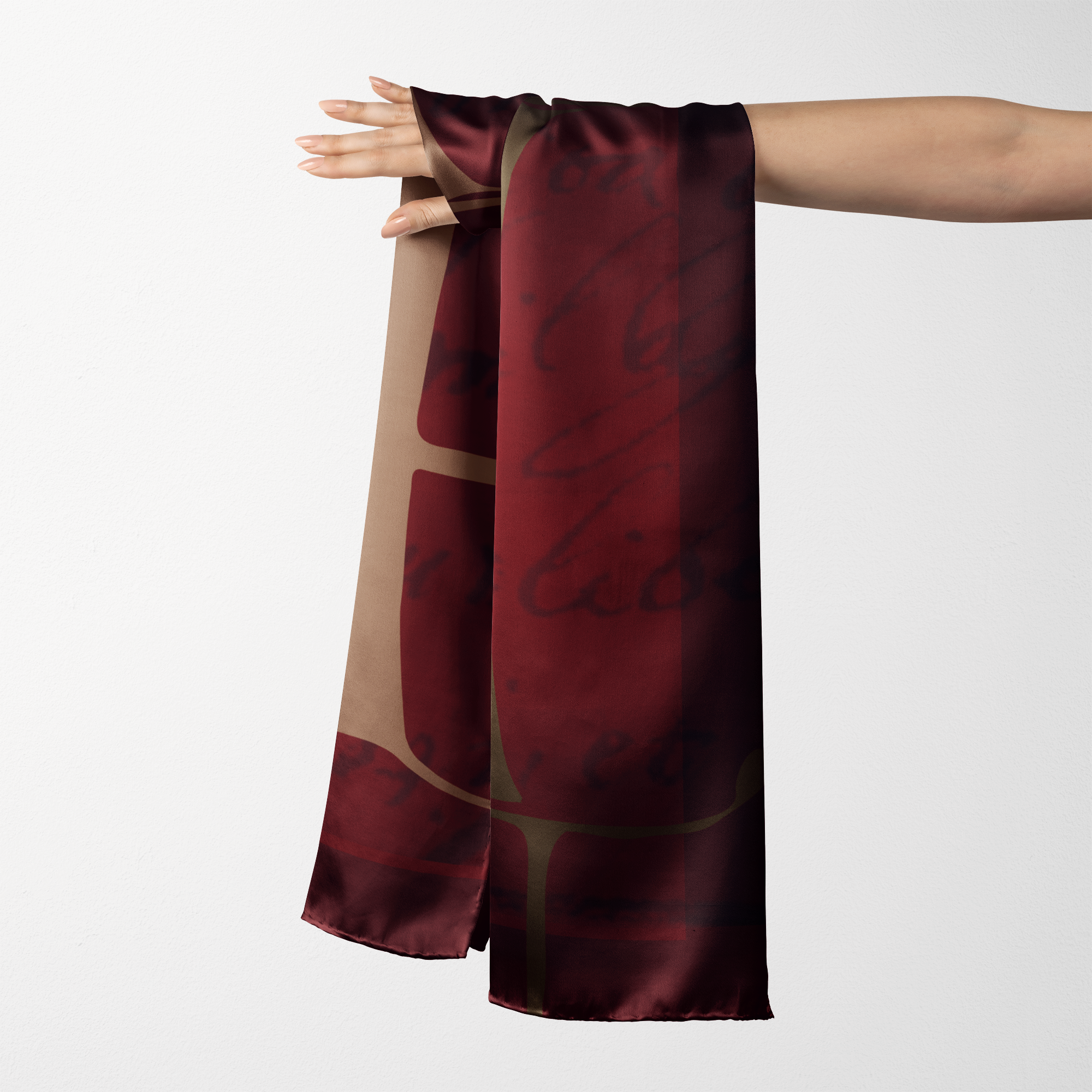 A deep, earthy red sets the tone of this piece, with textual manuscript excerpts decorating the background. The warm tones of the scarf are pulled from color schemes found across the manuscripts.