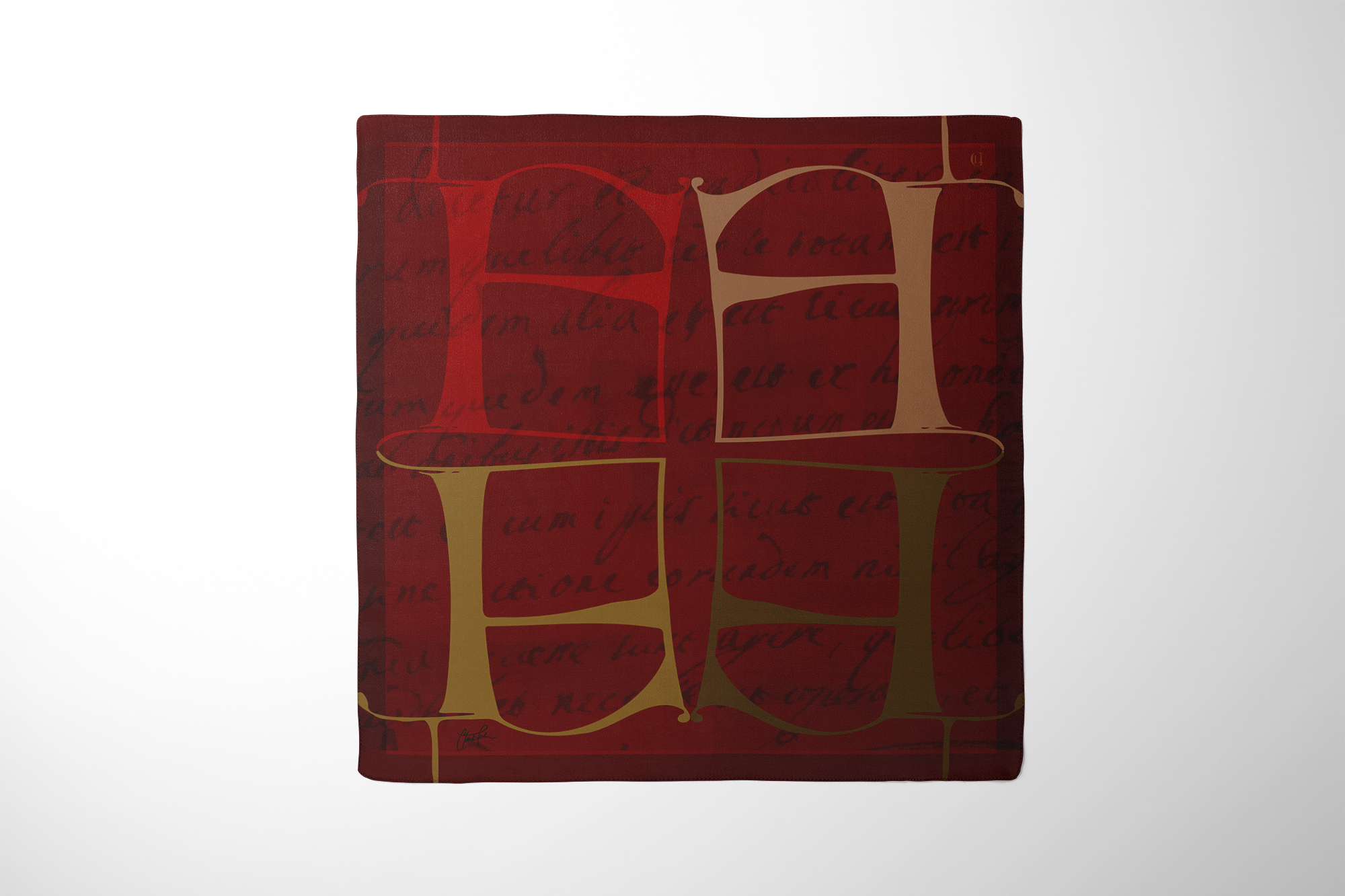 The scarf expresses the complexity and depth found within the pages of the ancient books, many handwritten by the Franciscan monks. The show logo was created from the Franciscan "F" found in a precious manuscript, and was adapted into a modern form for the show's brand. This letter is repeated on the scarf design.