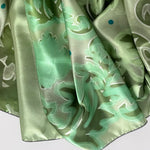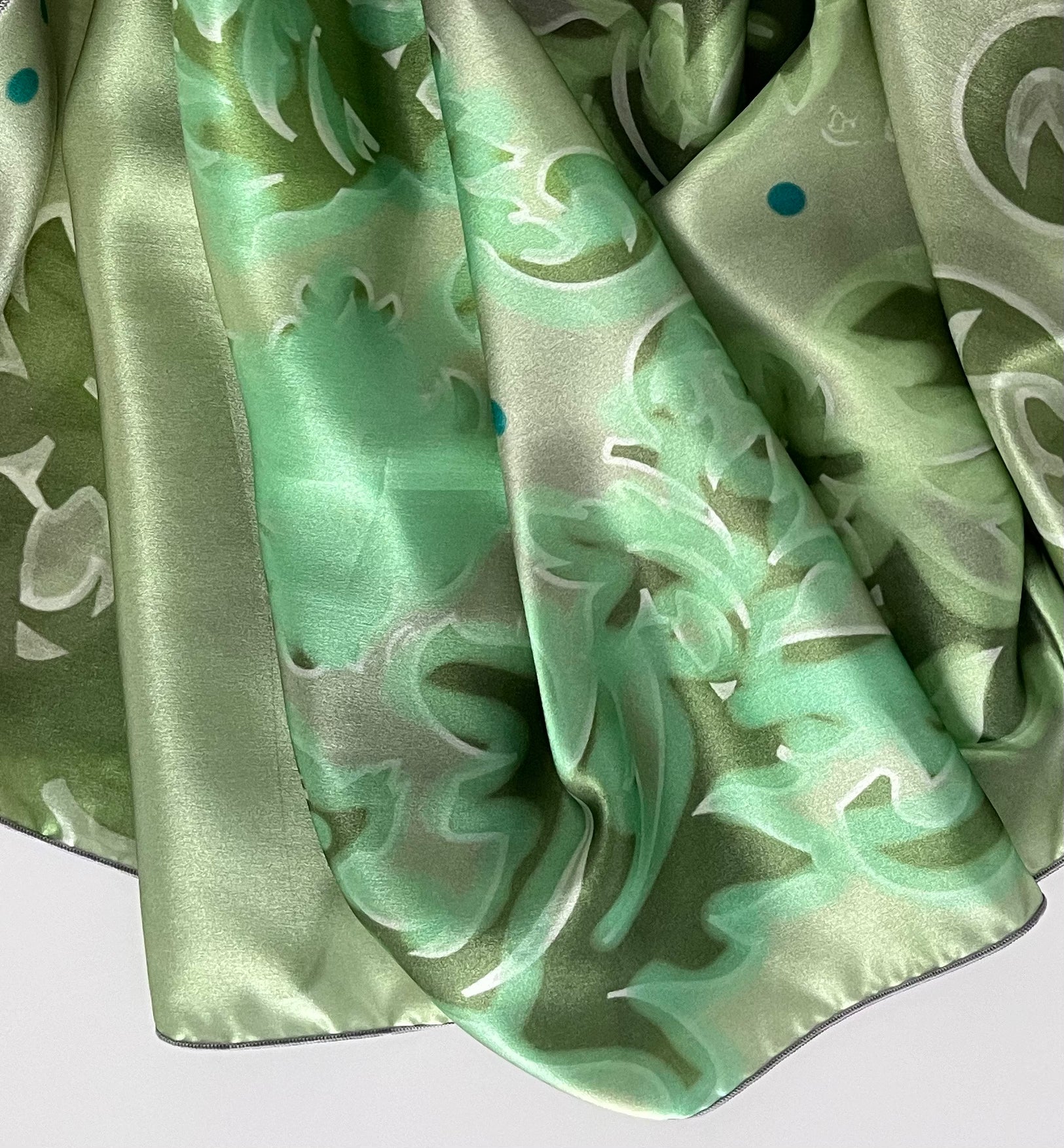 This captivating design showcases three meticulously crafted motifs, each embellished with hand-drawn overlays that ensure a harmonious balance. Crafted from opulent 100% silk fabric, the Rococo Sage scarf transcends the realm of mere accessory, becoming a wearable work of art that effortlessly adds a touch of timeless elegance to your daily style.