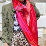 Sagittarius has a vibrant red background adorned with bold hues of pink, turquoise, and orange. Immerse yourself in the exuberant and free-spirited tribute to the Sagittarius sign, where the calligraphic rendering is brought to life with lively and dynamic colors. Each stroke captures the adventurous and optimistic essence of Sagittarius, creating a joyful and meaningful connection. Wrap yourself in this uniquely printed large silk square painting to infuse your day, outfit, and mood with celestial allure. From the Zodiac line, each scarf is a bespoke painting, embodying the essence of the zodiac signs. Crafted from luxurious 100% pure silk, these scarves offer a contemporary and sophisticated expression of astrological beauty. Discover the Zodiac line, where each scarf is a captivating journey.