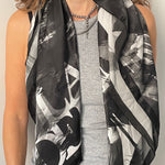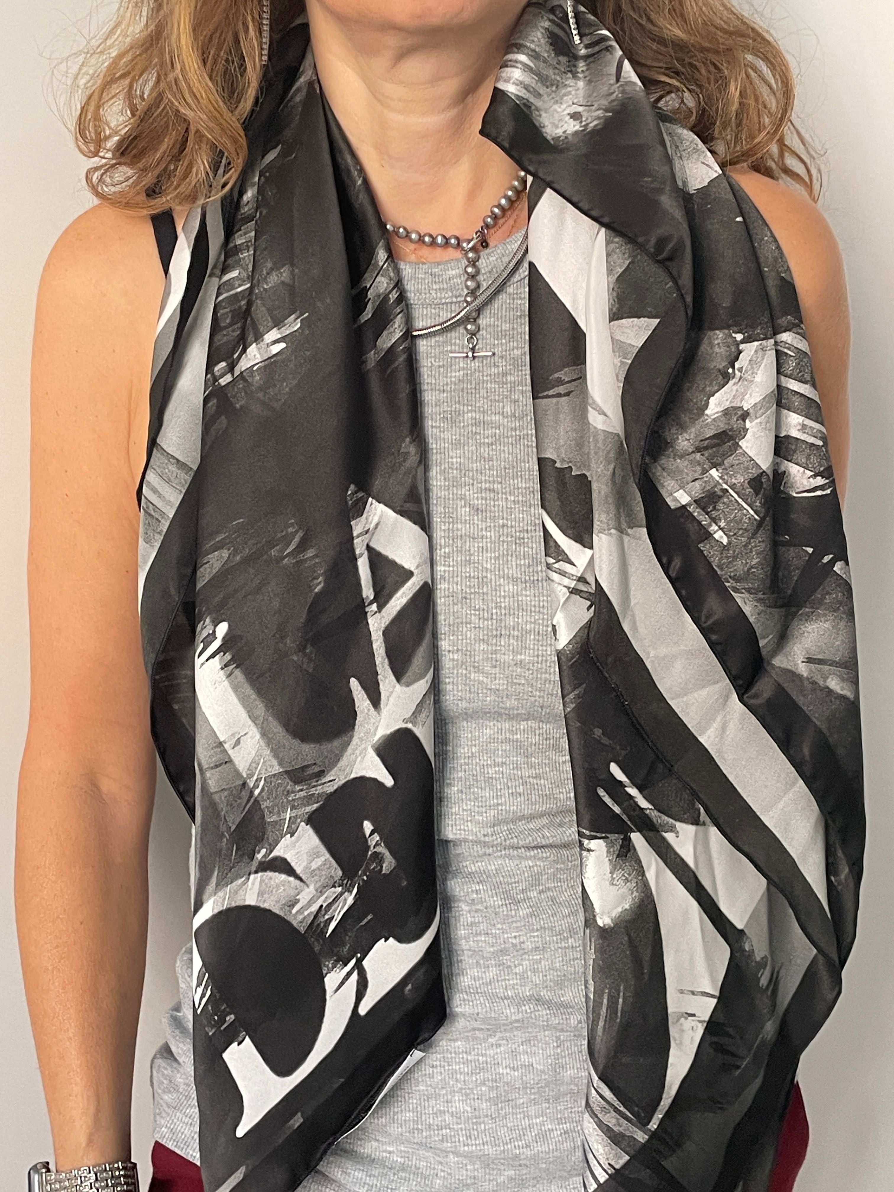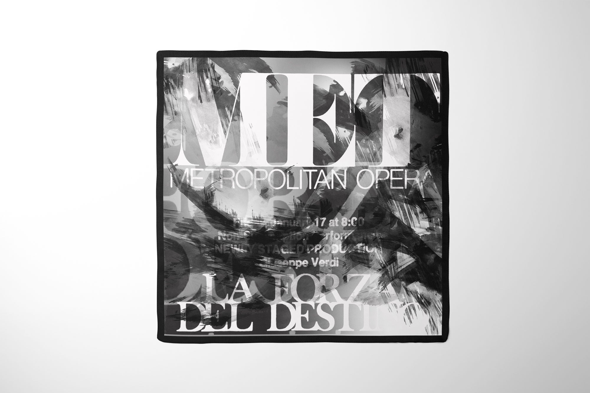 This exquisite scarf features a vintage poster from the Met Opera's production of La Forza del Destino, forming a subtle background to the artist's expressive brush strokes. The result is a captivating interplay of black and white, enriched with subtle hints of silvery gray. It's a shimmering design that captures the essence of New York City's sophistication and elegance, mirroring the grandeur of the Met itself.