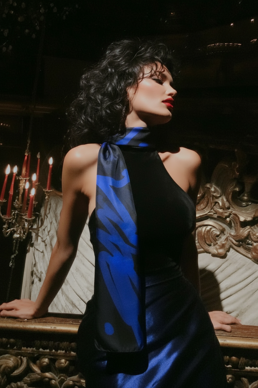 A luminous silk scarf in deep night blues, accented by a striking sapphire passage, inspired by Giacomo Puccini’s La Bohème. This unforgettable line, sung by Rodolfo, encapsulates the poet’s simple yet profound declaration of existence: “How do I live? I live.”