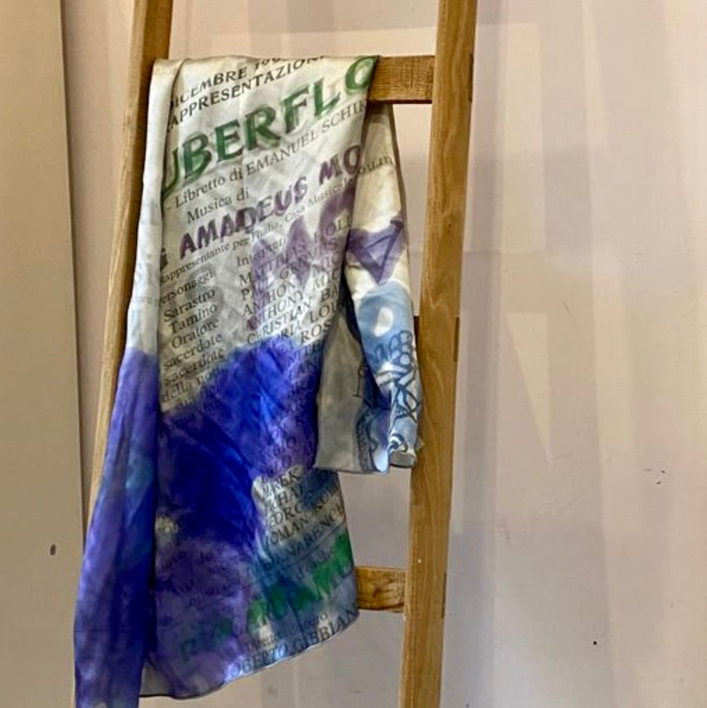 Here is Zauberflöte, that artistically pays tribute to Mozart's The Magic Flute. The iconic lettering of La Scala’s vintage opera poster makes this oversized square scarf perfect for evenings out… at the opera or wherever your fancy leads.